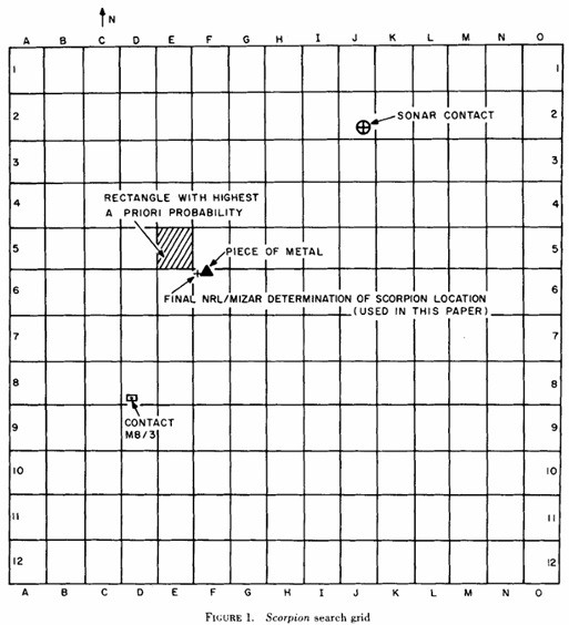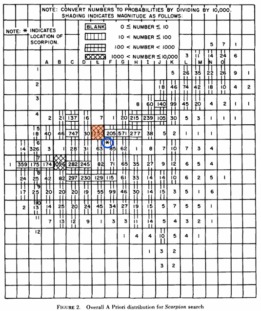 a conference was held July 18 where Dr. J. P. Craven and Dr. F. A. Andrews postulated nine scenarios concerning the events attending the disaster and assigned credences to them. These were then converted…to individual a priori probability distributions of the location of Scorpion corresponding to the respective scenarios, and these were combined as an average weighted by the assigned credences to obtain the overall distribution. Craven had earlier originated this approach in the H-bomb search. The calculations were performed by monte-carlo procedures.