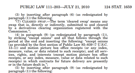 Hollywood’s lobbying of Congress quickly worked. Senator Blanche Lincoln from Arkansas inserted text into the 2010 Dodd-Frank Act (sponsored in the House by Barney Frank) amending the Commodities Exchange Act (CEA) to specifically ban film futures. This would be only the second product banned from futures trading after onions in 1958.