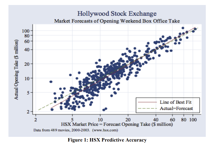 Despite using play money to trade, HSX markets were highly accurate predictors of movie box office. Over 12 years during their peak, HSX traders correctly predicted 82.1% of Oscar winners, while MovieStock prices were highly correlated (0.94) with the respective film’s actual box office receipts. It was trusted enough in Hollywood that studios such as MGM and Lionsgate were using HSX stock prices to inform their marketing decisions.