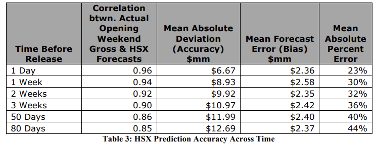 Benjamin Olsho compared HSX box office share prices with the actual four-week box office receipts among 98 films released from July 2011 to January 2013. Markets were highly correlated with the actual box office, even 80 days from opening weekend: