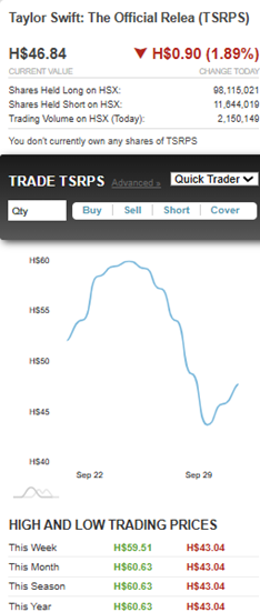 MovieStocks: These are stocks for the domestic North American box office of a specified film in its first four weeks of wide release. Shares are priced at 1/1,000,000 of the film’s actual box office. The market price of a MovieStock reflects how much money traders think the film will earn. For example, if a MovieStock for Taylor Swift’s upcoming “The Official Release Party of a Showgirl” is priced at H$48.64, the market believes the film will earn $48.64 million in its first four weeks.